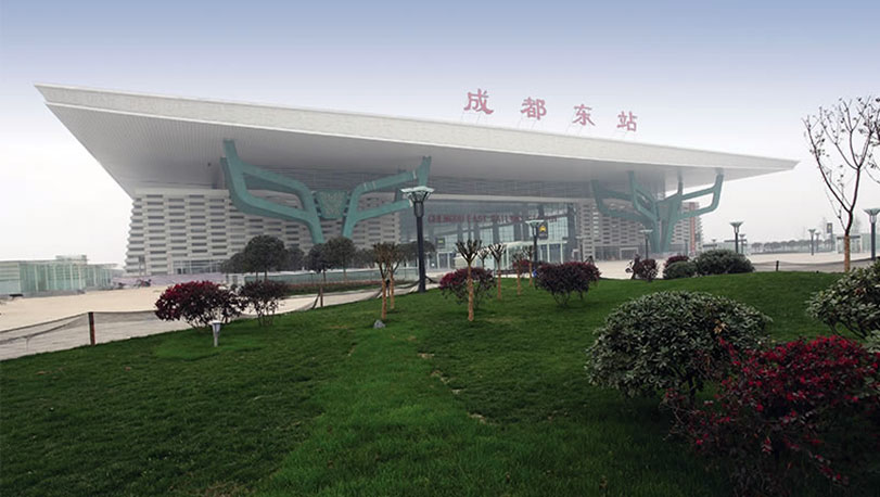 成都火車東站位于成都市東三環(huán)路,2010年開始建設(shè),車站面積約22萬平方米。在設(shè)計(jì)上引入了大量的文化元素,東、西廣場的進(jìn)出口都用了三星堆的青銅面具元素,屋頂引入了金沙太陽神鳥的火焰造型,被定為一等客運(yùn)站。使用了寶鋼鍍鋁鋅