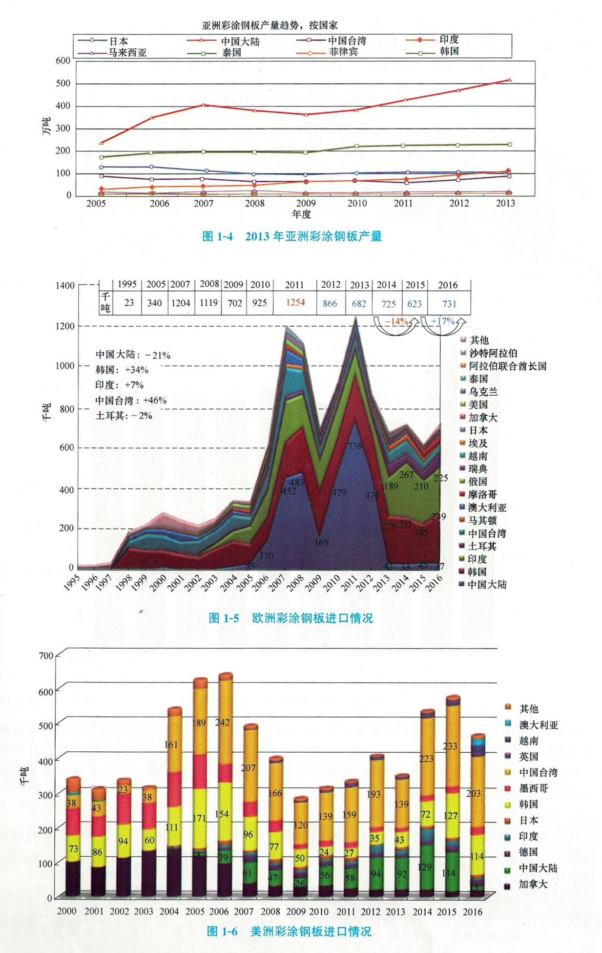 近年來,亞洲彩涂鋼板產(chǎn)量總體呈上升趨勢(圖1-4)。其中,中國大陸上升趨勢明顯,印度次之。2013年中國大陸彩涂鋼板產(chǎn)量超過500萬噸。由于亞洲產(chǎn)能的迅速增加,使大量產(chǎn)品流向歐美,影響了全球的彩涂鋼板產(chǎn)品市場。近二十多年進(jìn)口到歐洲的彩涂鋼板量見圖1-5,2016年歐洲進(jìn)口彩涂鋼板約73萬噸,主要來自韓國和印度:近十多年進(jìn)口到美洲的彩涂鋼板量見圖1-6,2016年美國進(jìn)口彩涂鋼板約45萬噸,主要來自韓國和中國臺灣。2013年以來中國大陸在這兩個主要市場的出口均因反傾銷而基本退出。