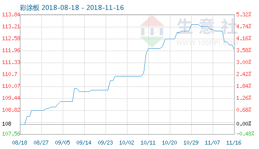 彩涂板商品指數(shù)自2018-11-1起,16天陸續(xù)下降了1.156%。