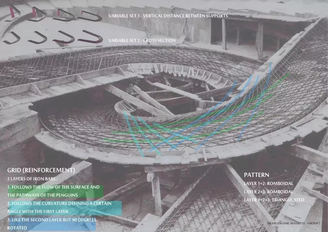 沿著坡道方向布置主筋,內圈及外圈加密,沿著斜向布置交叉斜筋,順應了主應力的方向。
