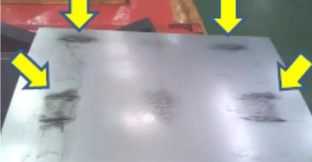 摩擦黑斑:是一種“產生原因+典型形貌”的命名方式,本質上是薄板產品層與層之間發(fā)生位移造成的磨損。