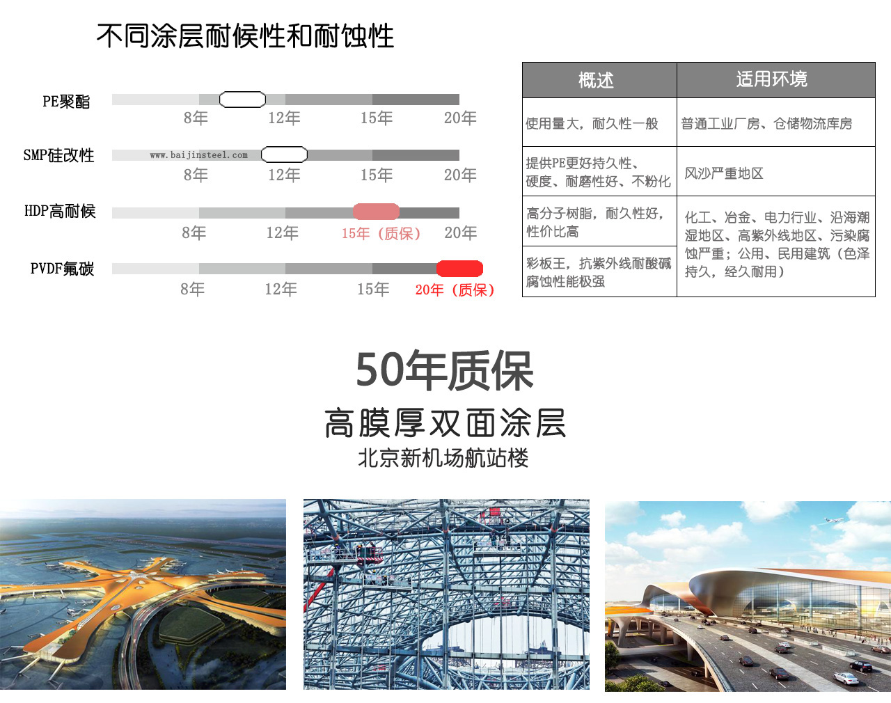 PE涂料對于材質有良好的附件著性,彩涂鋼板易于加工成型,價廉且產品多,顏色和光澤的選擇余地大。在一般環境直接曝露下,基防蝕年可長達7-8年,但于工業環境或污染嚴重的地區,其使用壽命會相對降低,且聚脂涂料對耐紫外光性與涂膜耐燁化性,并不理想,因此PE涂料的使用仍受到若干限制,一般用在空氣污染不嚴重的地區或需多次成型加工的產品。寶鋼PE聚酯彩涂板在一般環境下具有7年的質保年限。